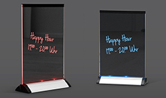 Die LED Writing Board Systeme sind aus Kunststoff und Acrylglas gefertigt, und mit einer beleuchteten Schreibfläche ausgerüstet. Die Schreibtafel lässt sich mit dem im Lieferumfang enthaltenen Spezialschreiber individuell beschriften, und mittels mitgeliefertem Reinigungstuch jederzeit wieder abwischen.